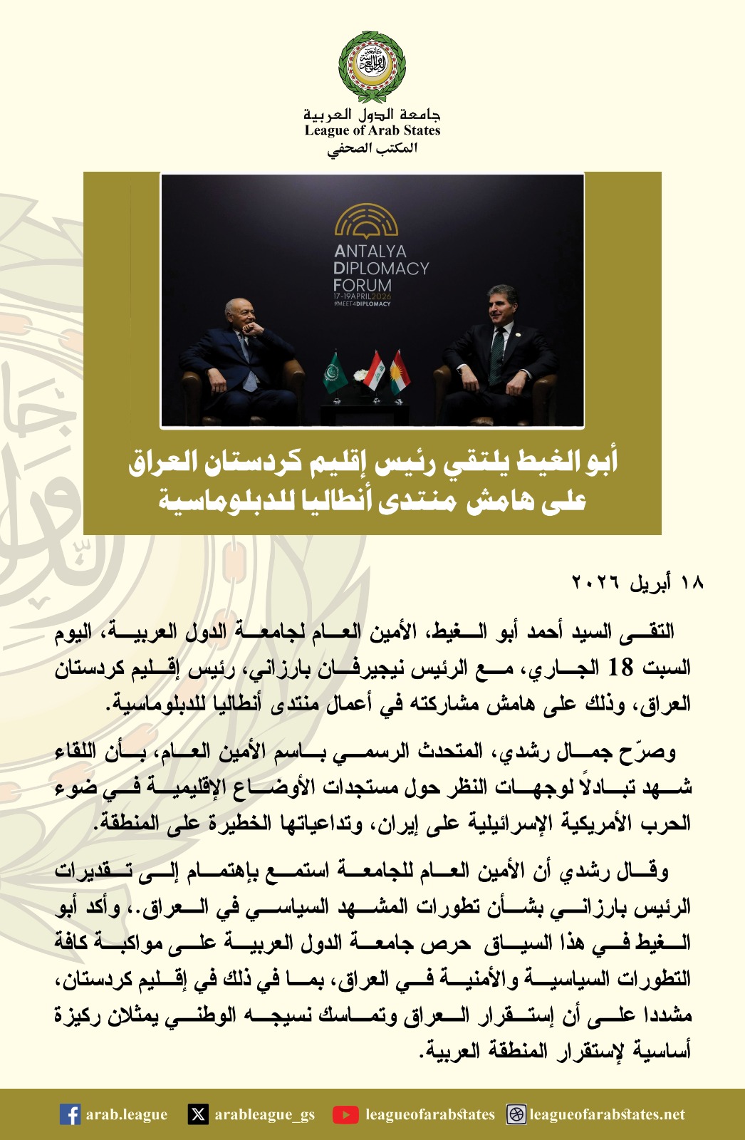 وأكد أبو الغيط في هذا السياق حرص جامعة الدول العربية على مواكبة كافة التطورات السياسية والأمنية في العراق، بما في ذلك في إقليم كردستان، مشدداً على أن استقرار العراق وتماسك نسيجه الوطني يمثلان ركيزة أساسية لاستقرار المنطقة العربية.